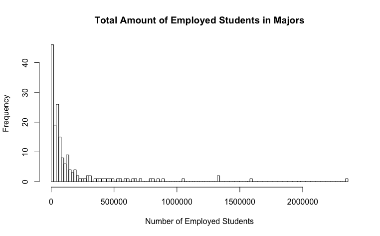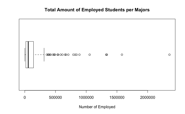 The boxplot is similar to the Total boxplot and it helps the viewer see the pieces of data that are detached from the box's 4th quarter. The 24 outliers are the same outliers that the column Total displayed on it's own boxplot graph thus implying that the most popular major with the most total number of majors are most likely be able to seek a job than those majors that aren't as popular as they seem to be on the boxplot. These outliers had values greater than 350,000.