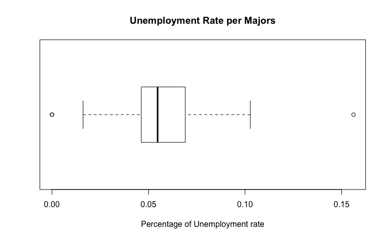 The boxplot of Unemployement_rate is unique in that it was different than the boxplot of both Total and Employed. This is significantly great because it shows 4 outliers that are dissimilar than the outliers of Total and Employed and when something is dissimilar, unexpected things can be found. The boxplot shows the percentage(s) of the Unemployement_rate, a small number than the amount of students since the amount of students exceeded more than 350,000, the Unemployment_rate did not. The data has a standard deviation of 0.019, a number that is quite closer to 0. The standard deviation shows how not spread out the data are from one another as seen on the boxplot.