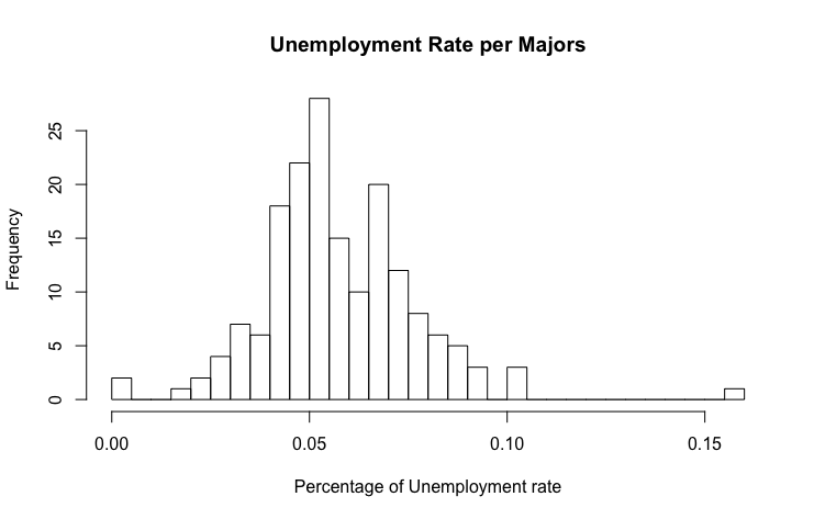 The Unemployed_rate column of my dataframe is defined as the rate in which unemployment happens on each majors listed on the all-ages.csv dataframe. The equation for unemployment rate is given by (Unemployed / (Unemployed + Employed)). The mean, standard deviation, skewness and kurtosis are: